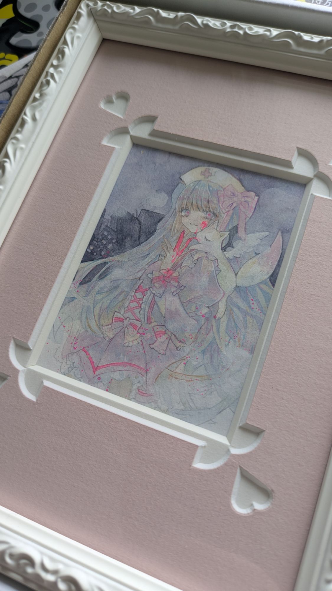 あと、このめちゃくちゃ可愛い額装も見てほしいです。ATCサイズなのですが、ダブル+飾りマットで可愛く仕上げてもらいました…!今回も山本文房堂さんに依頼しています。