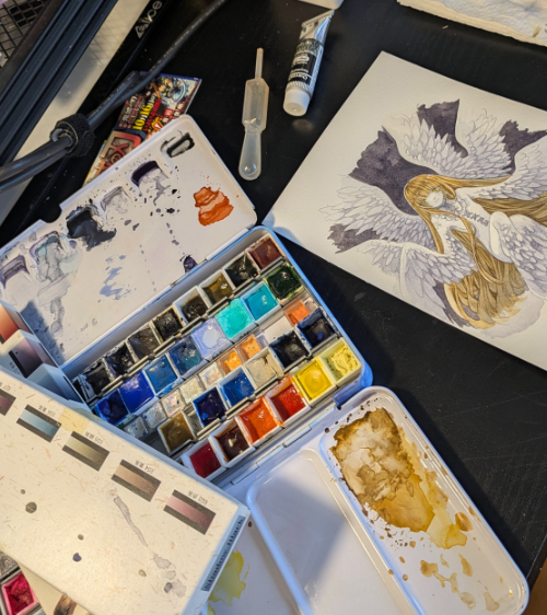 こちらは、ARTs*LABo COLORs 2024に出した作品ですね。レンブラントの三原色を使ったので、その3色のナチュラルな状態も見せたいな~~~~と思ってイラストの下に配置してみました。