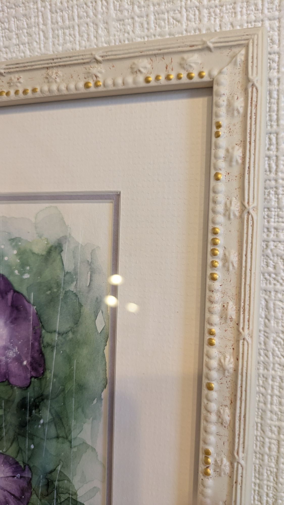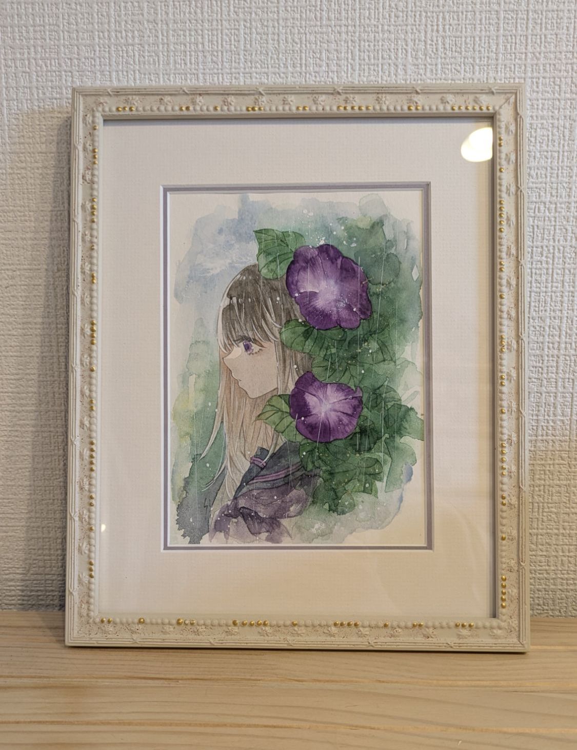 初めての額装作品ということもあり、マットも額縁もかなり悩んだ記憶があります笑 最終的には、ブルーグレーっぽいマットを選んでいますが、マットの幅が大きい(額に対して絵が小さい)ので、ダブルマットにしてなるべく余白を目立たたせないようにしても良かったかな~なんて思ってます。