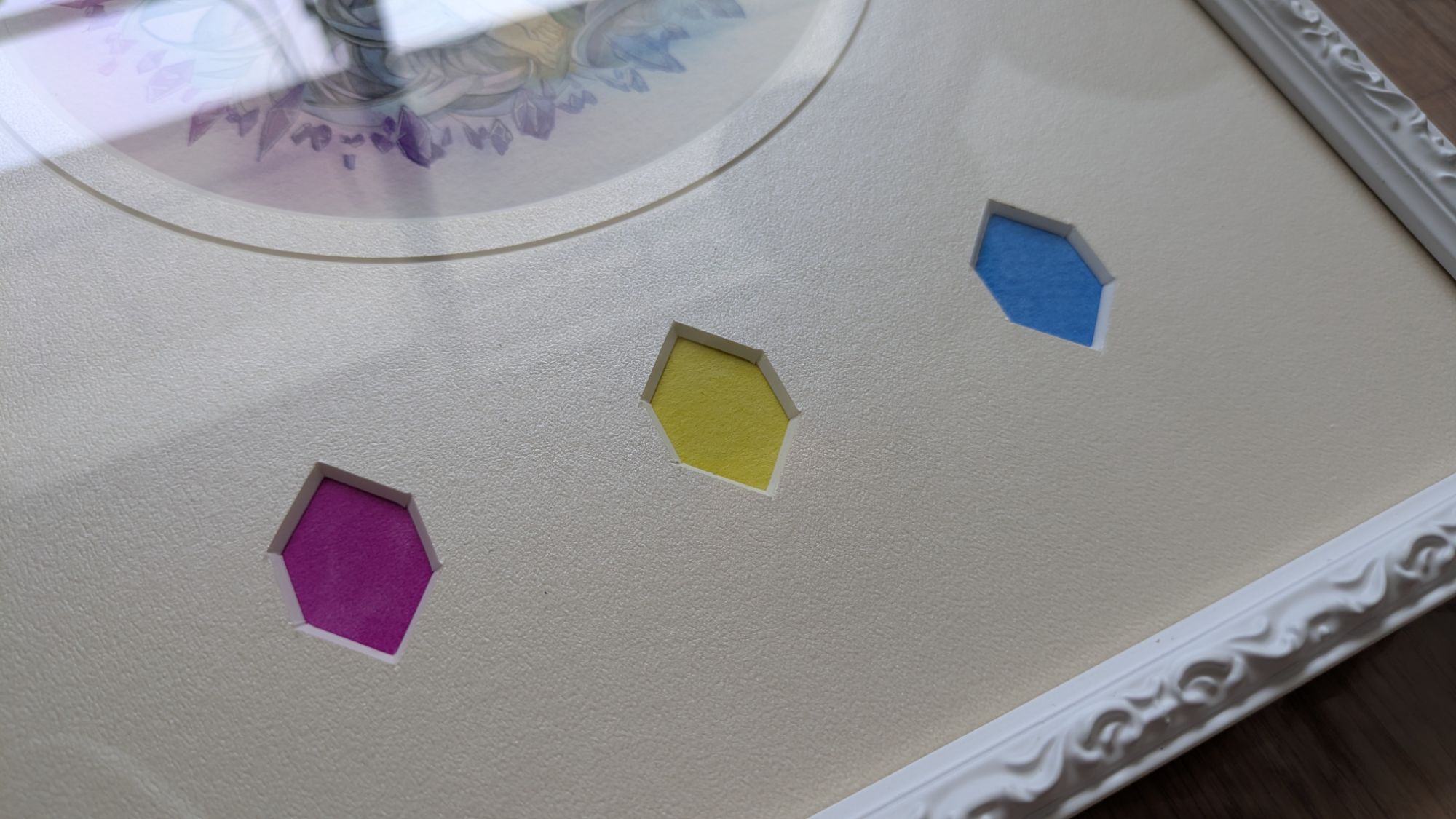 色採集マットに、Amazonで買った額をあわせたもの。レンガのように凸凹していて存在感がありますが、意外とイラストと合わせやすい額です。(↑は白ですが、キラキラしたものもあります)
