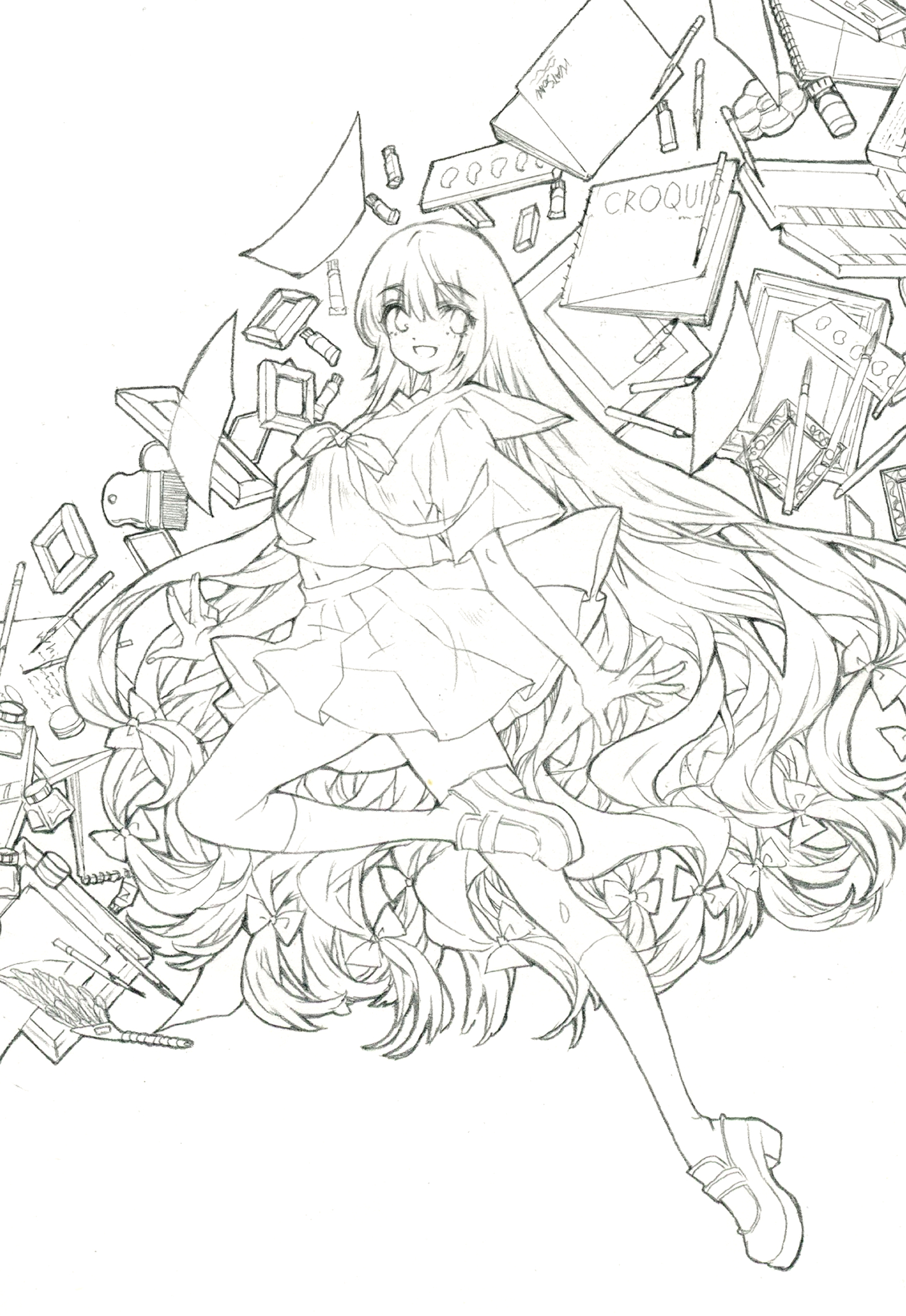 例えばこちらの線画ですが、キャラクターの輪郭線を太くしています。また、背景に小物を散らばめていますが、小物のアウトラインも太くしています。逆に、キャラクターの内部は細い線のままにしています。