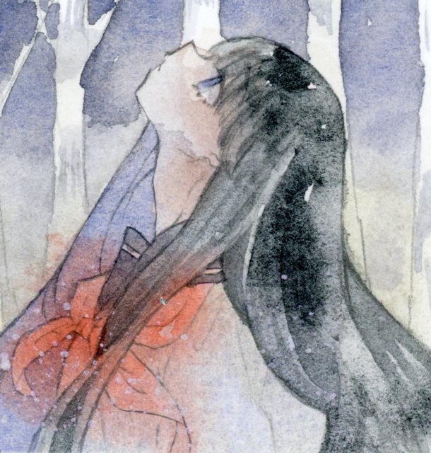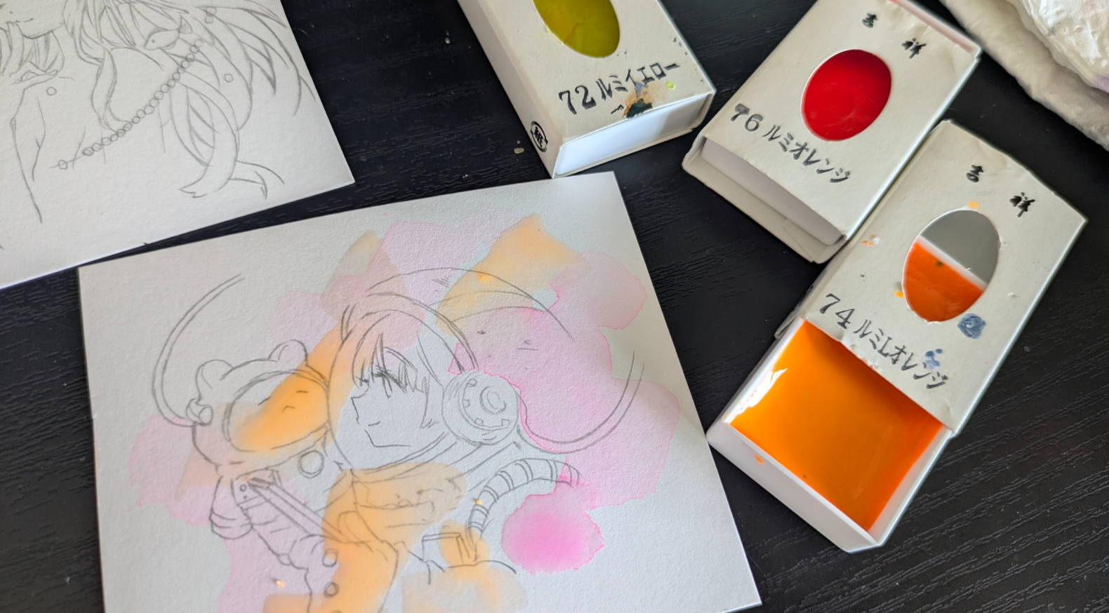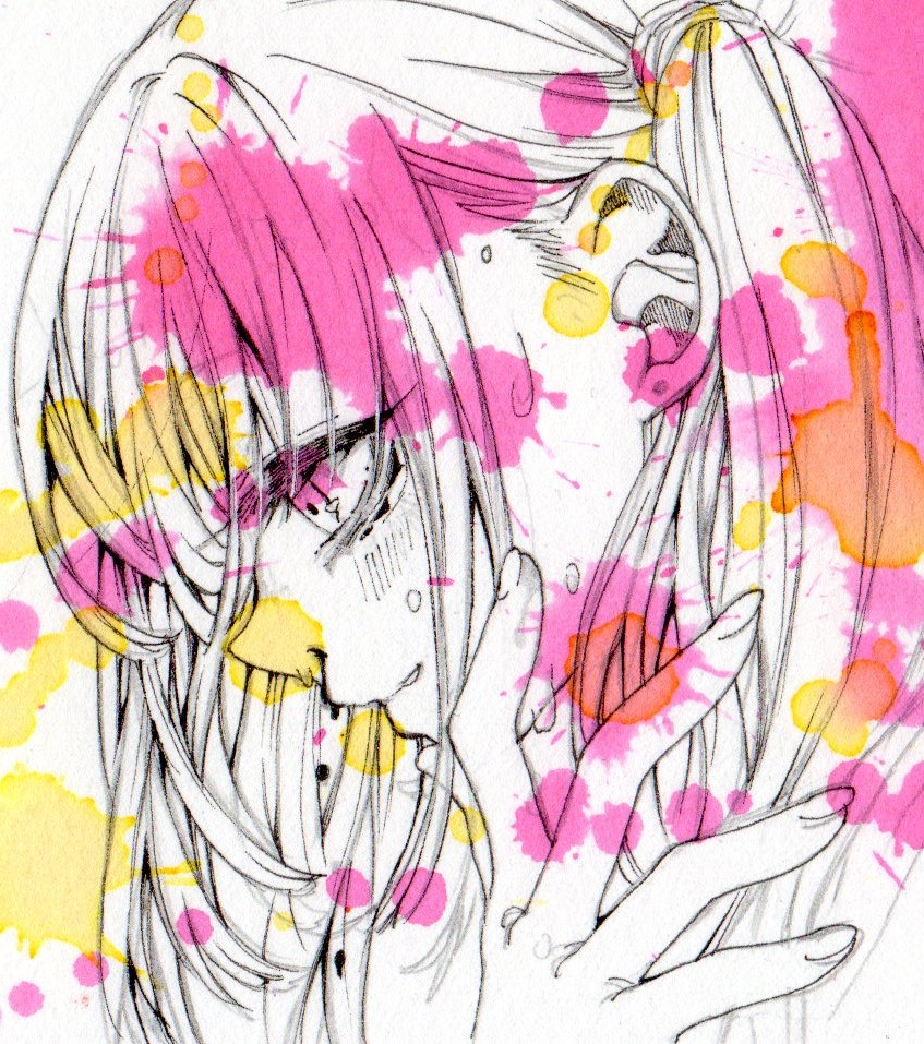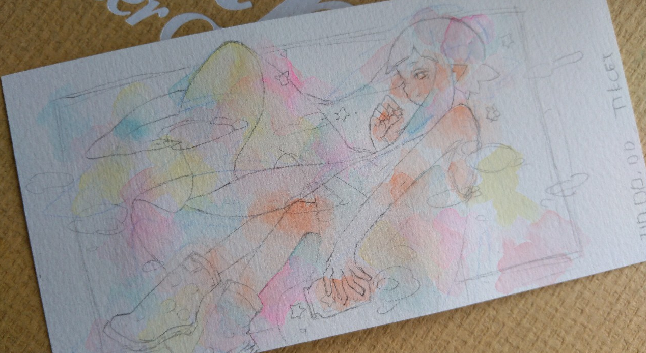 ちなみに、線画はつけペン+リキテックスリキッドです。アクリル絵の具で乾くと耐水性になるため、水彩の線画にも使えるすぐれものです。