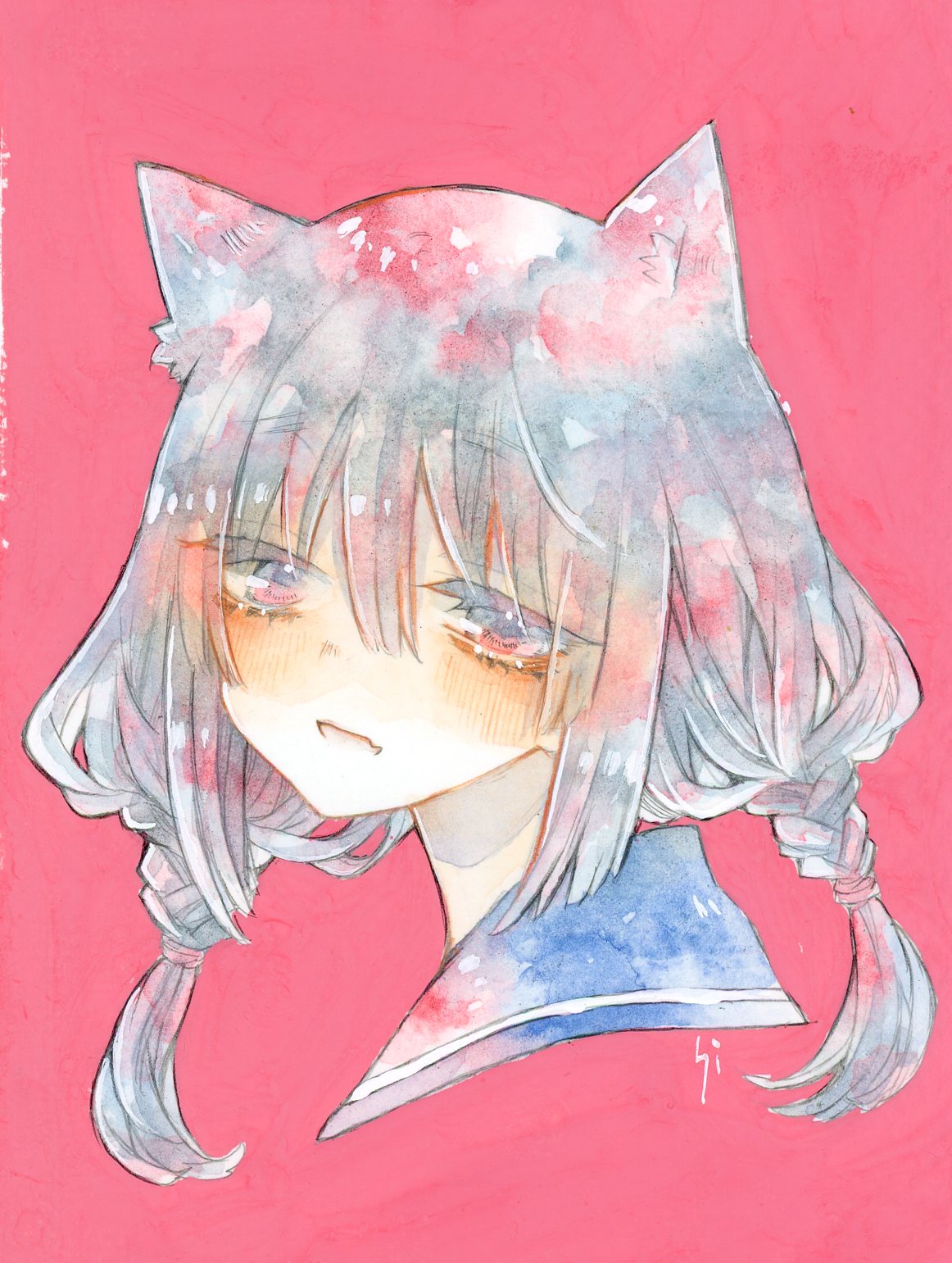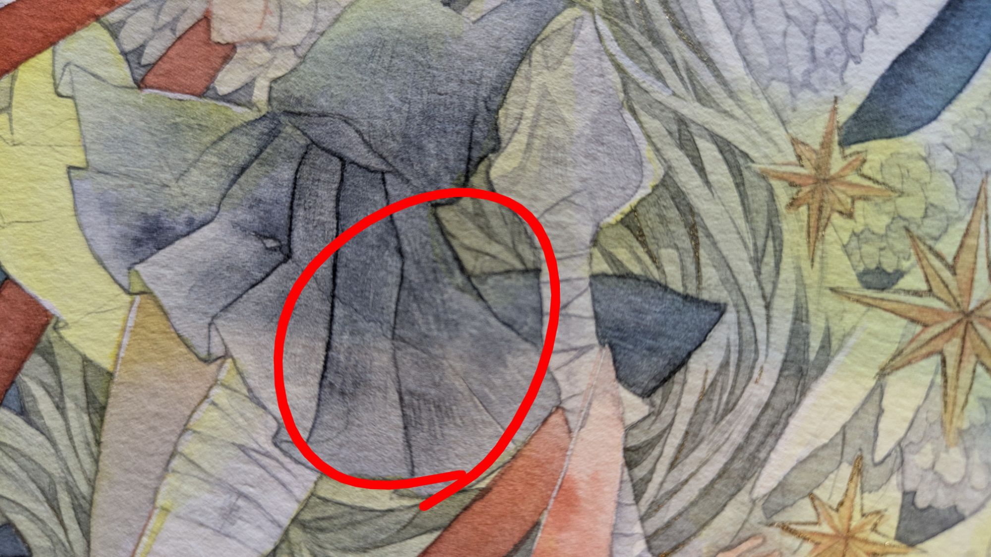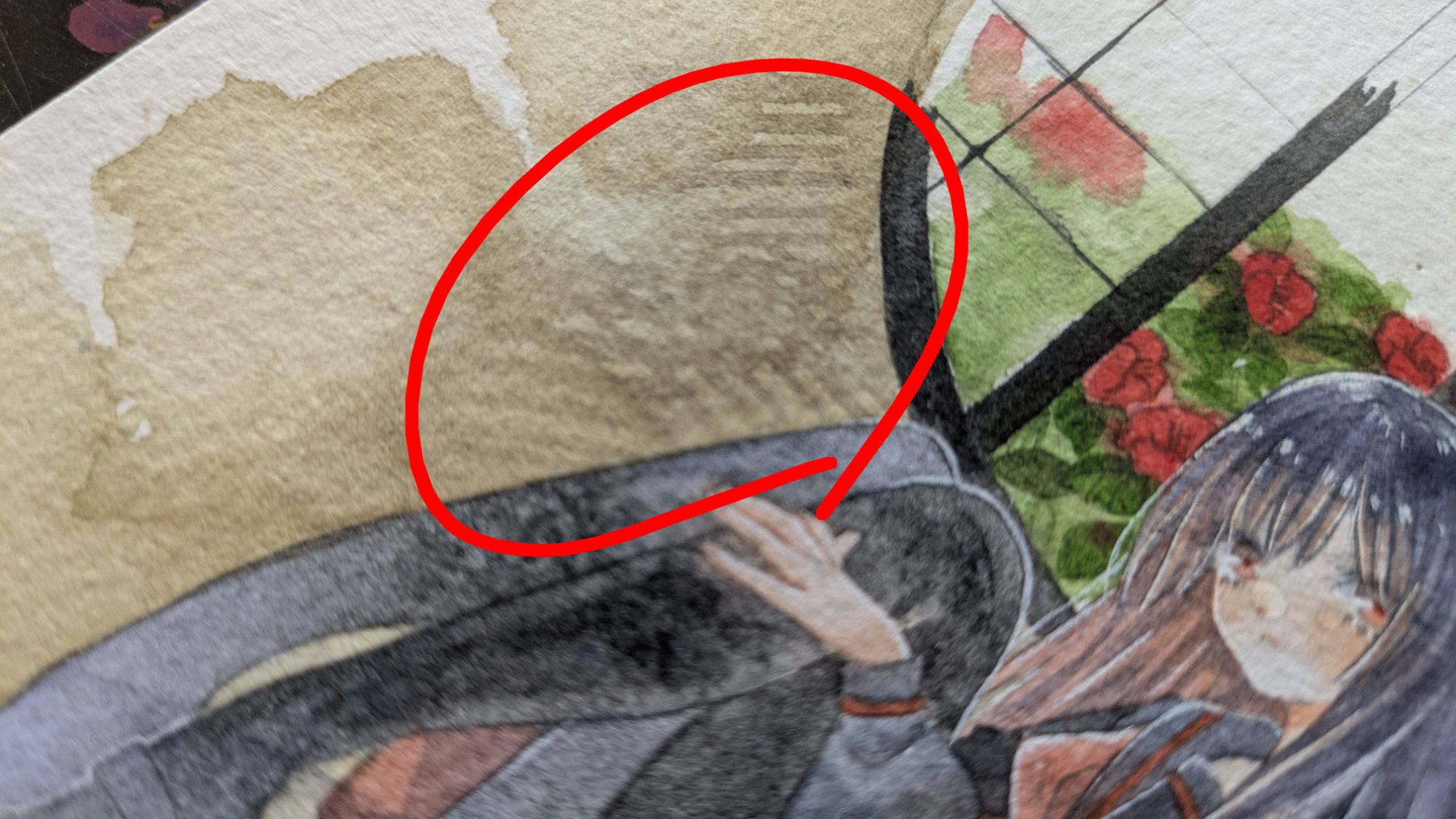 こちらは、背景を不透明水彩でベタ塗りしています。スキャン画像だと伝わりにくいのですが、原画でみると水彩絵の具と不透明水彩絵の具の質感の違いなどが感じられて面白いです。