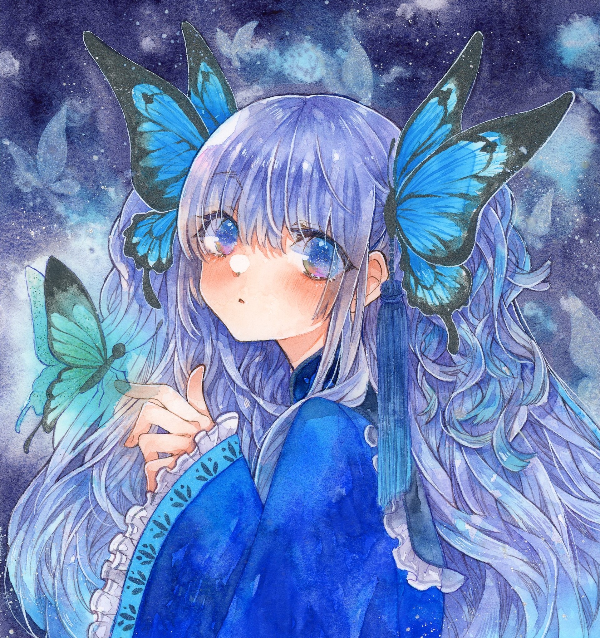 線画では、指先の蝶々・洋服は青、目は茶色、髪はグレー系とそれぞれ線画の色を変えています。