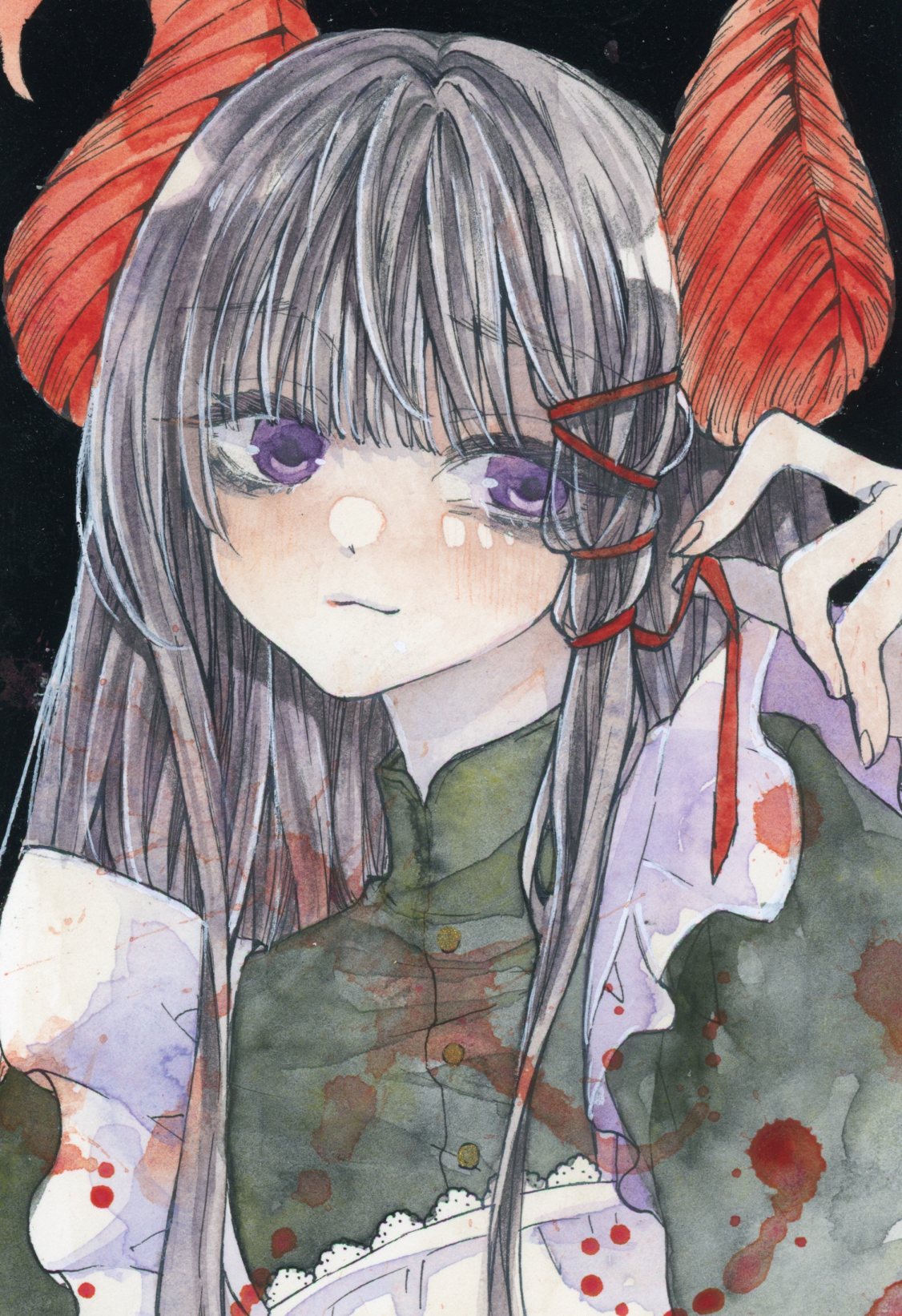 大きめでコシの柔らかい筆に、たっぷりの水で溶いた絵の具を含ませて、勢いよく筆を振ると血しぶきのようなスパッタリングができます。