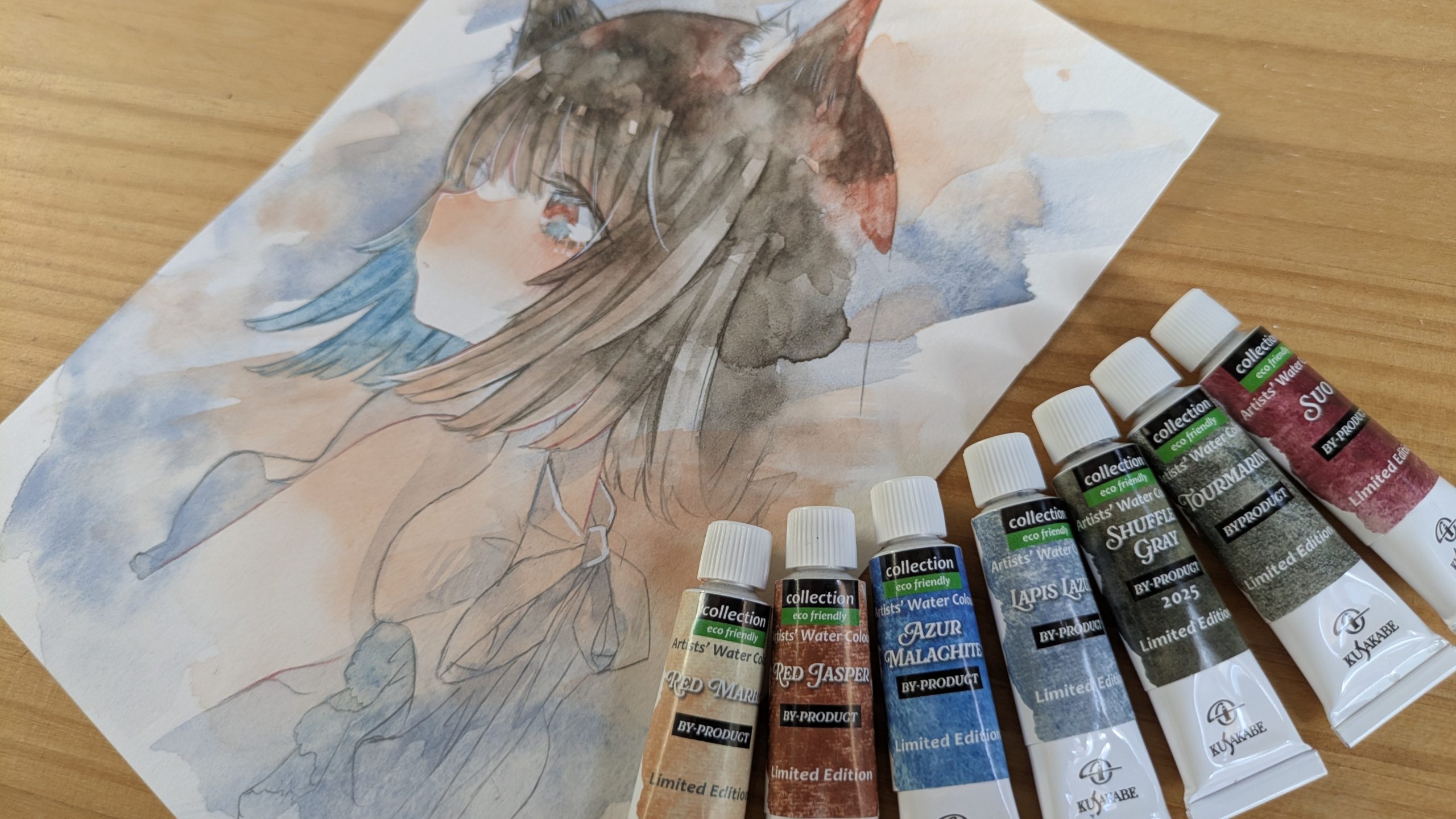 イベント限定「コレクション」エコフレンドリーシリーズのクサカベ水彩絵具。希少な原料から顔料を抽出した後の廃棄予定の素材から、更に経験と技術をもとに手間と時間をかけて2回目の顔料を生み出し作られた、アップサイクル絵具。